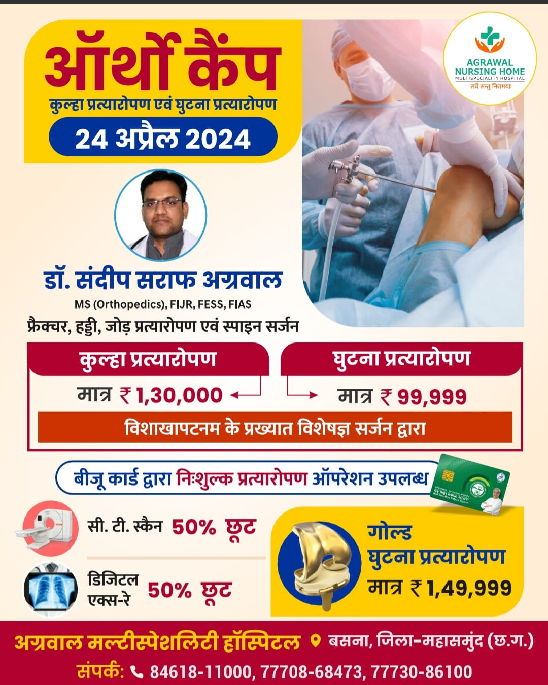 बसना के अग्रवाल नर्सिंगहोम बसना मे कुल्हा प्रत्यारोपण एवं घुटना प्रत्यारोपण 24 अप्रैल 2024